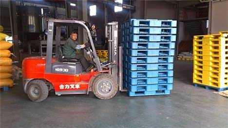 叉車(chē)是搬運(yùn)塑料托盤(pán)的常用工具,常見(jiàn)的有人力叉車(chē)(地牛)、電動(dòng)叉車(chē),以及搬運(yùn)大型托盤(pán)用的機(jī)械叉車(chē)。在使用叉車(chē)對(duì)塑料托盤(pán)進(jìn)行搬運(yùn)的時(shí)候應(yīng)注意以下事項(xiàng):